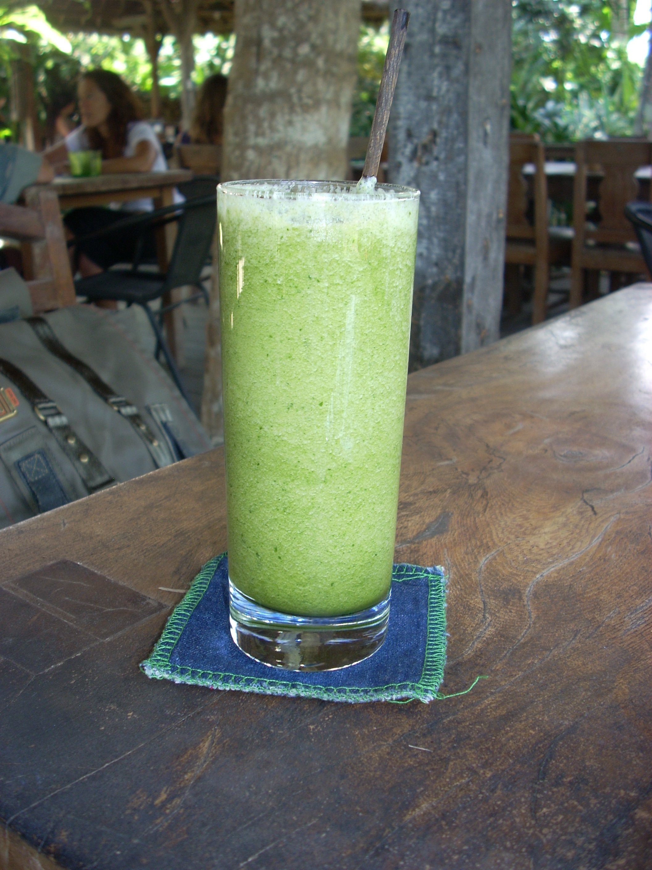 There is a wonderful, organic cafe at the Yoga Barn called Little K. After chatting with the receptionist for a few minutes I made my way down the moss-covered steps, under a tangle of vines, to a platform under a huge thatched roof.