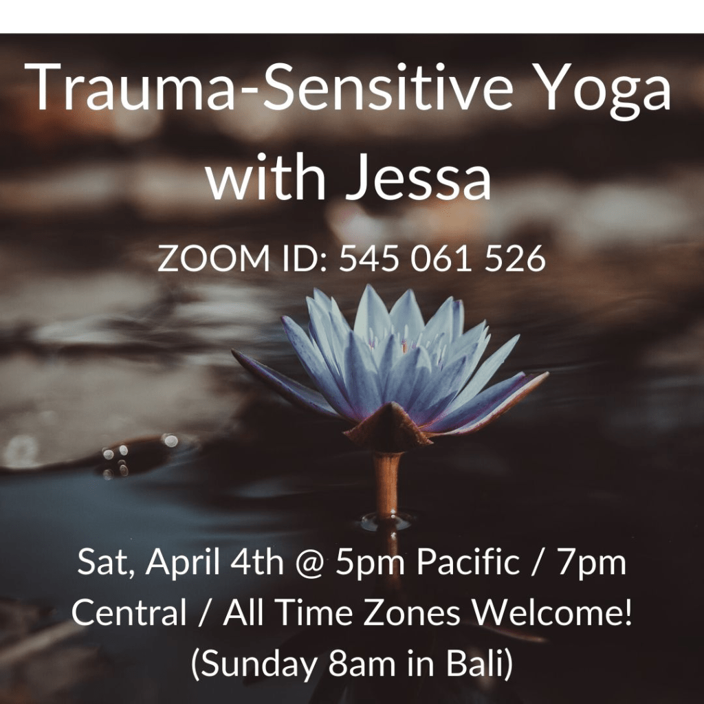 “If you’d like, please join me for a 75 minute Trauma-Sensitive Yoga session over Zoom this Saturday, April 4 @ 5pm Pacific Time (or Sunday 8am in Bali).