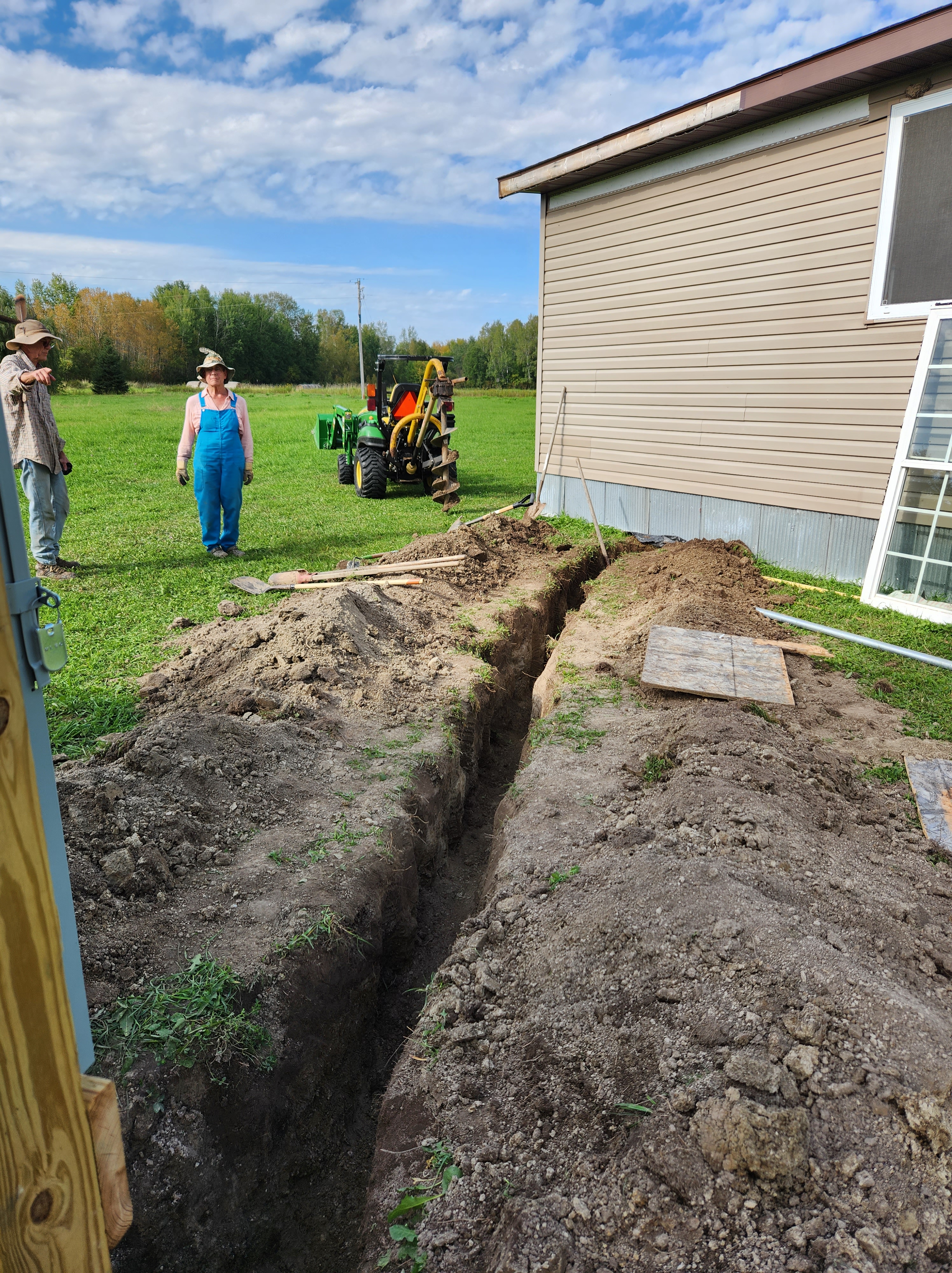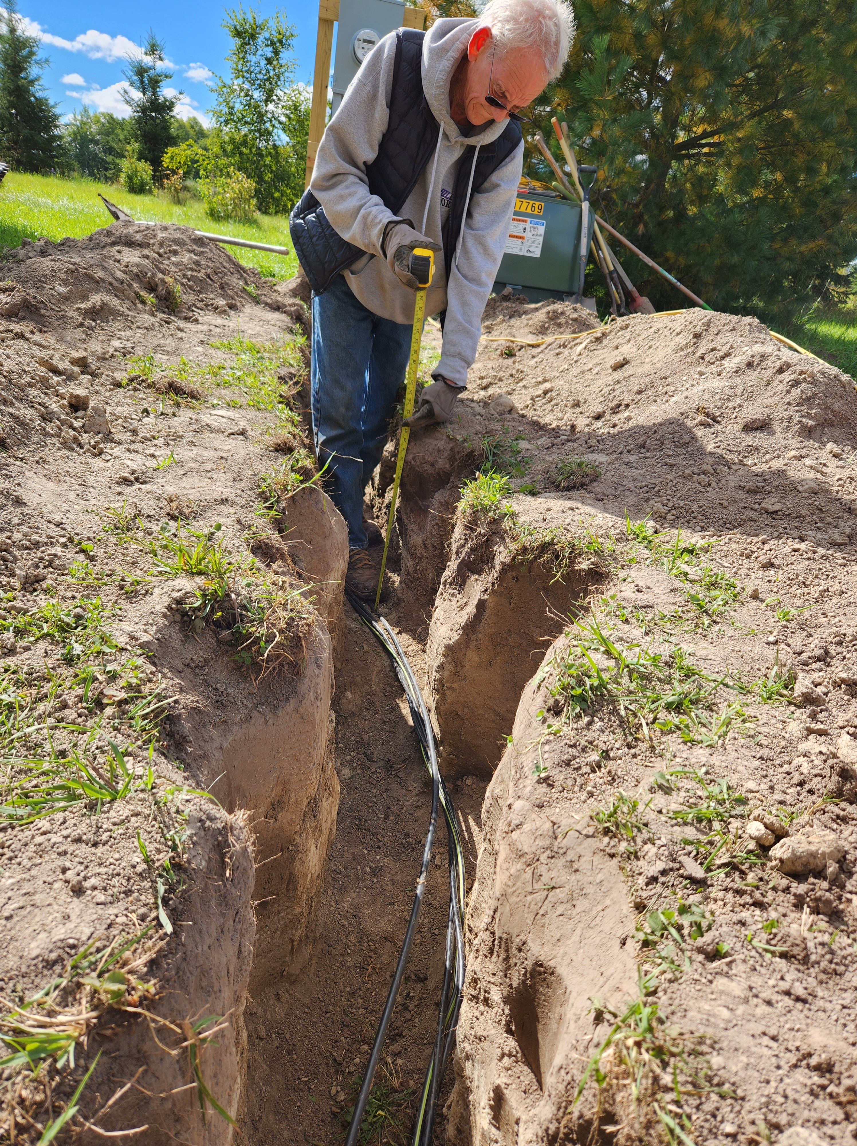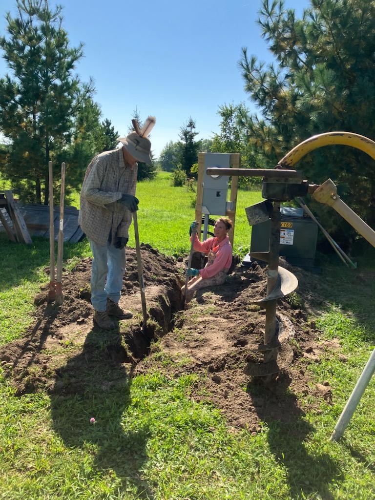 For a gasp-worthy fee, electricity was trenched from the closest pole to a pedestal near the house. I won’t have a well or septic system in my semi-off grid tiny house, but electricity was a non-negotiable must. When the electric company left, we still had to bring the cable to the house in a 4-foot deep ditch. It was an endless, grueling day.