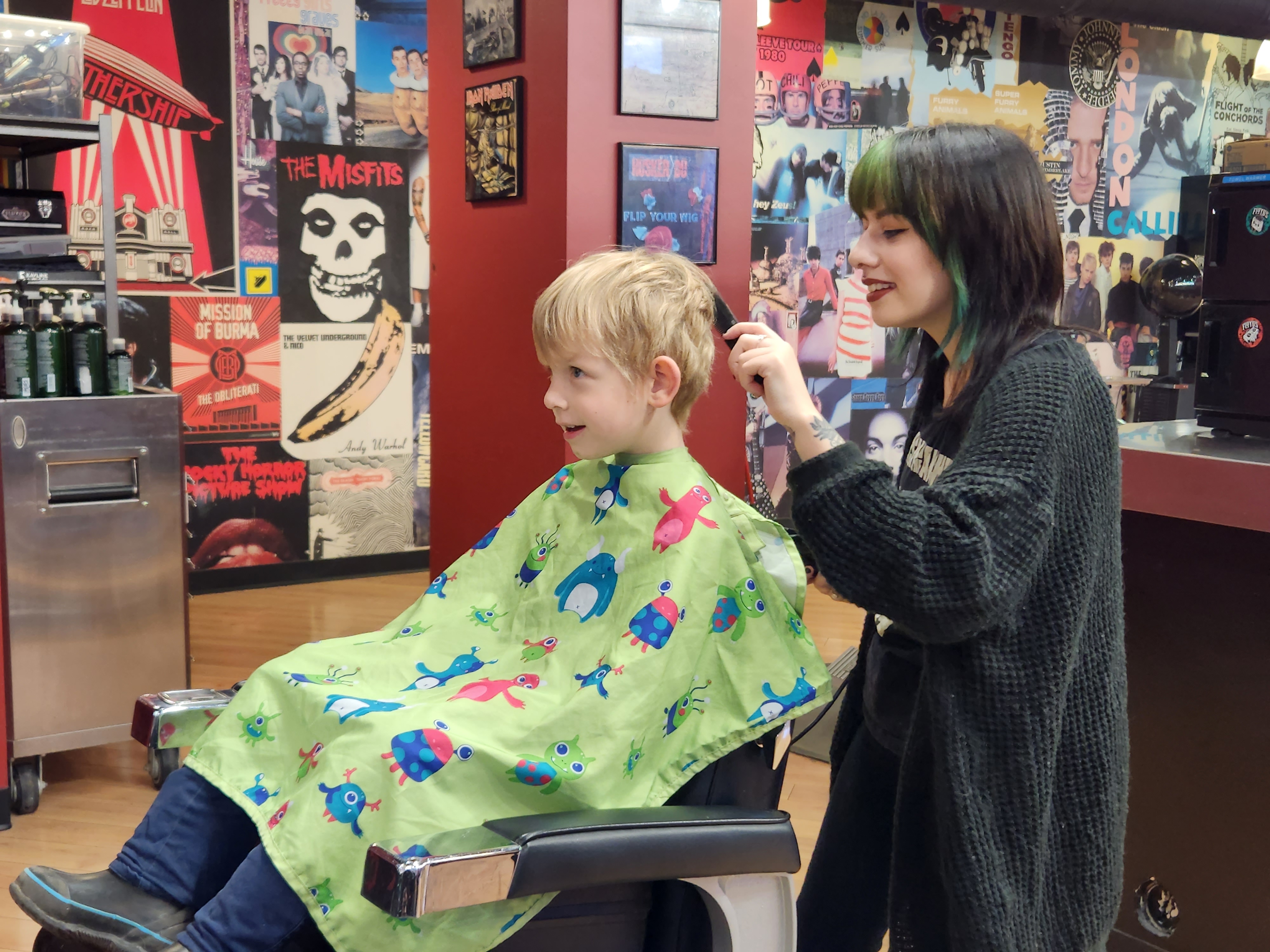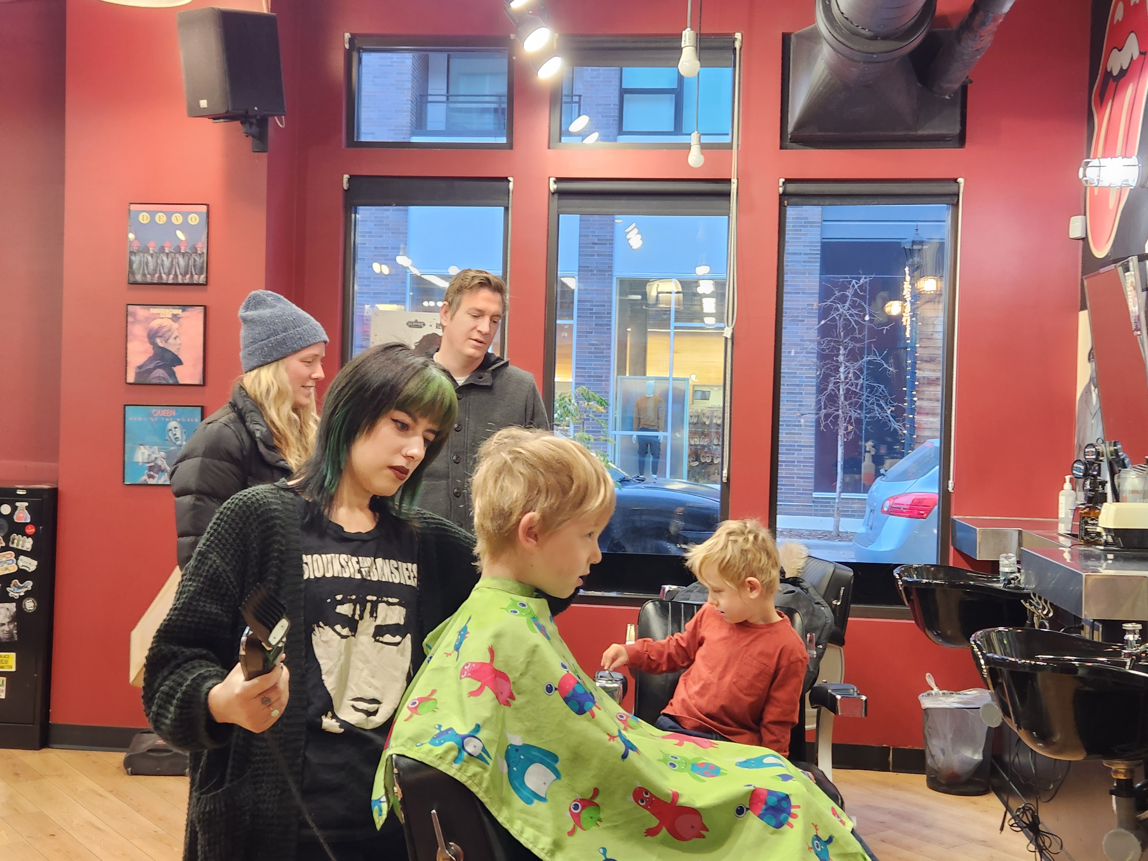 In November I took a much-needed break and went to Minneapolis for the twins’ birthday. Haircuts for the boys at Floyds in Uptown was a festive event. Mom and Dad asked them how they wanted their hair cut. Rowan went into great detail describing the front, back, and sides that translated into something suspiciously like a mohawk. Mom and Dad exchanged glances. Remy was quick and to the point: very, very short.