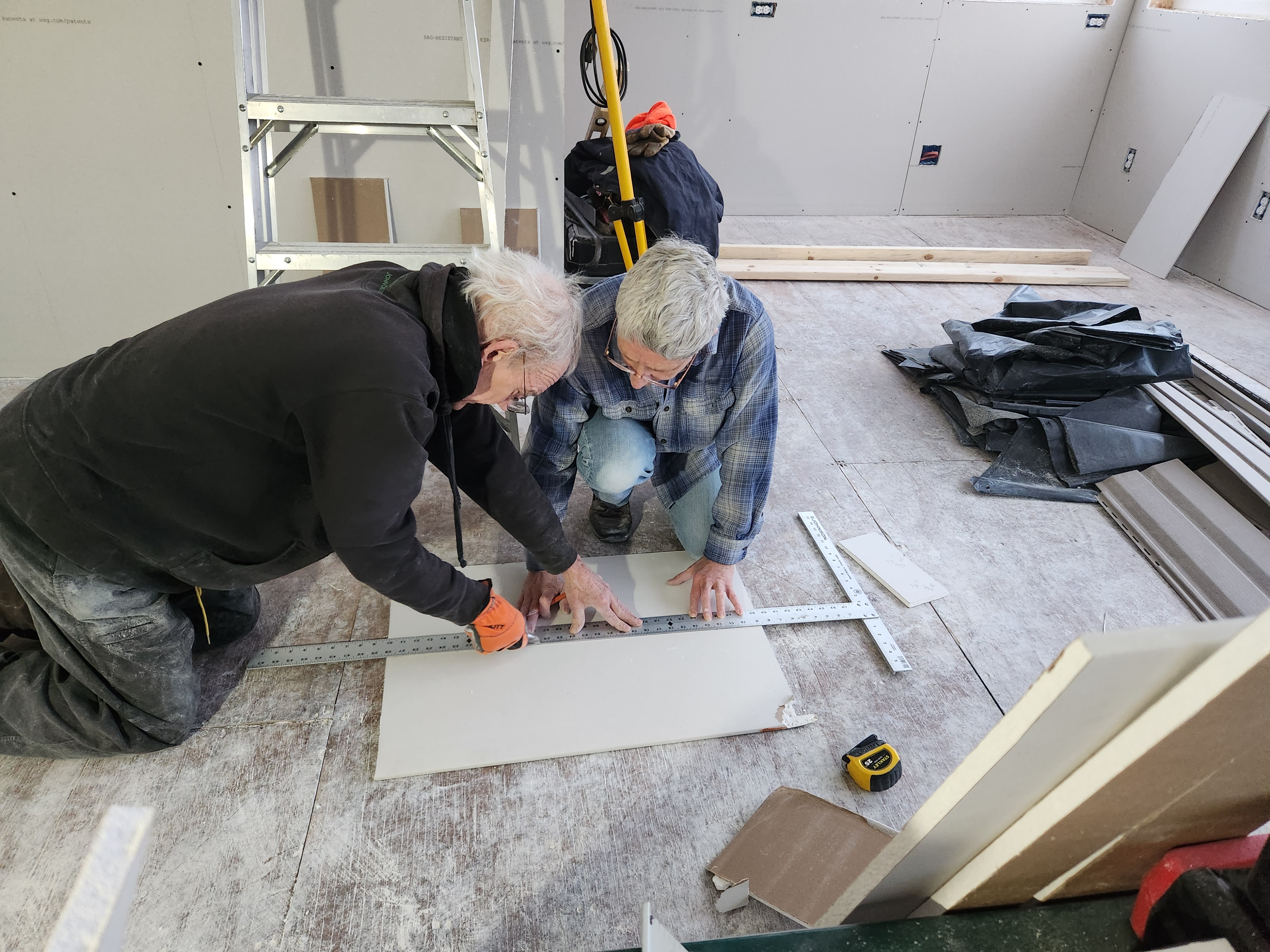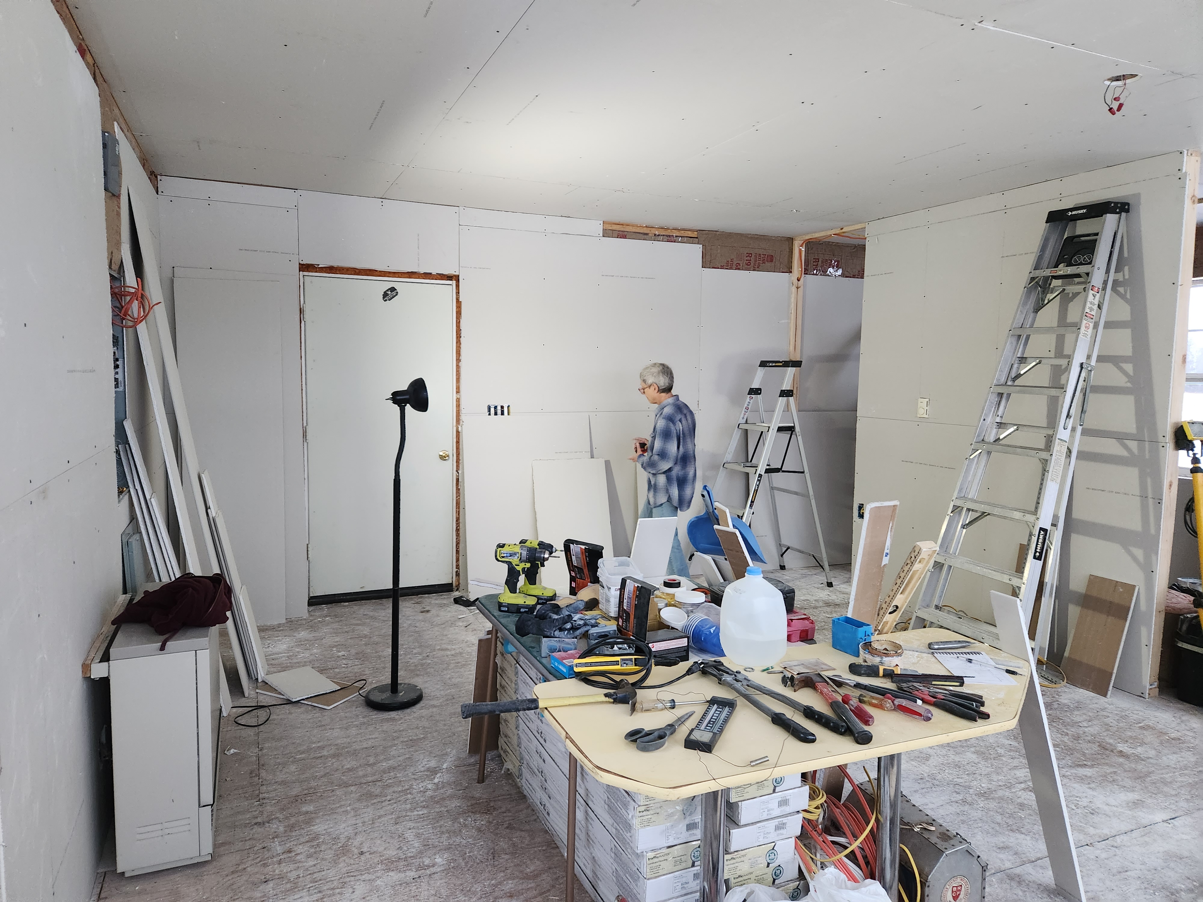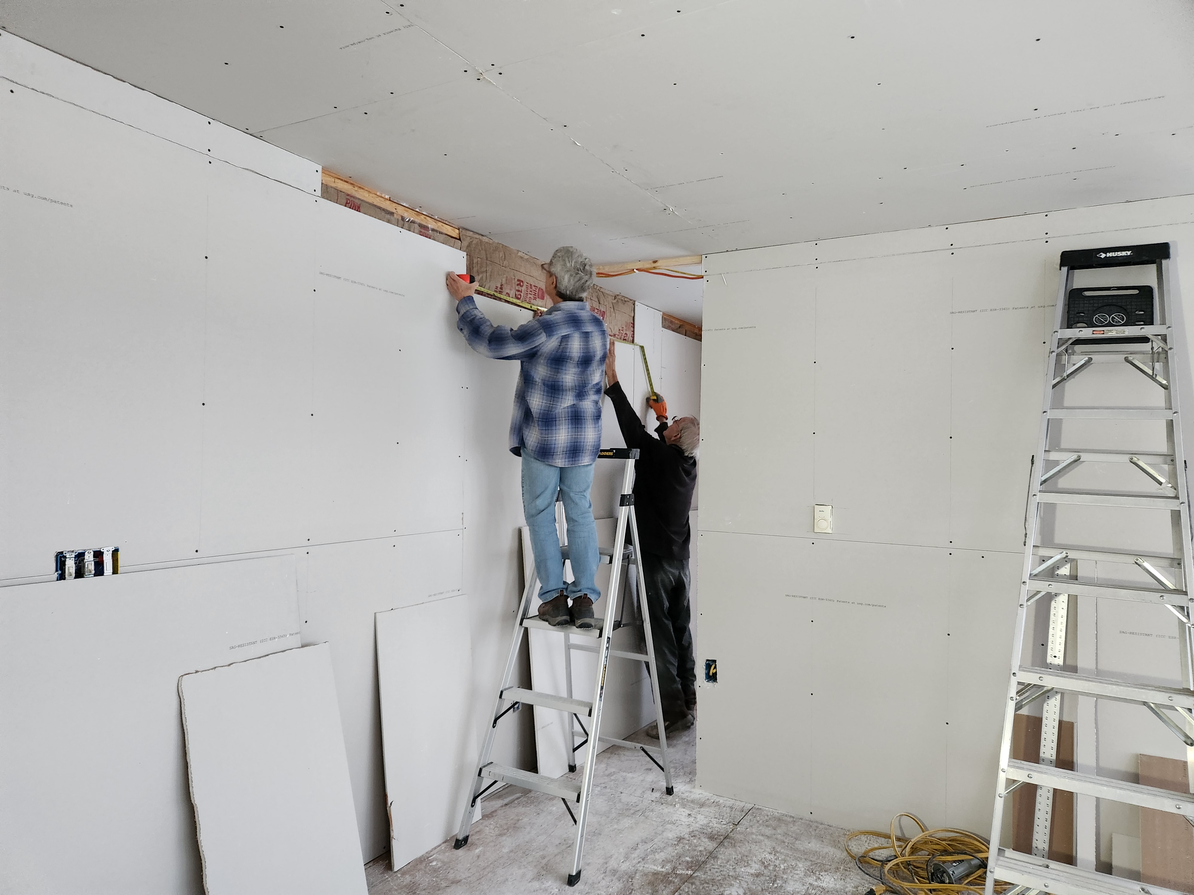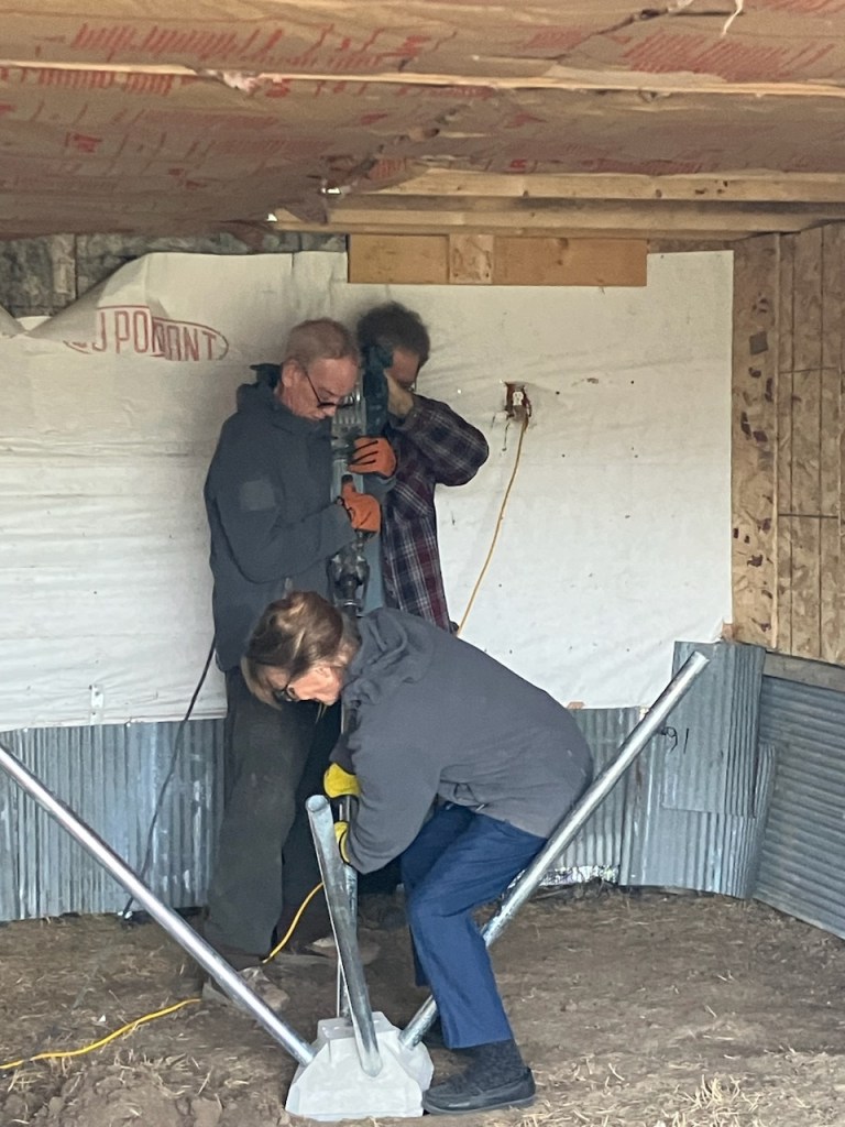 Back at the farm, the house awaited my return and the dreaded sheetrocking process. Young(er) neighbors, Kent and Bruce, came to help with the ceiling – a brutal task but they made it look easy. W used his head. In the three days following, Gwen, W, and I finished the walls.