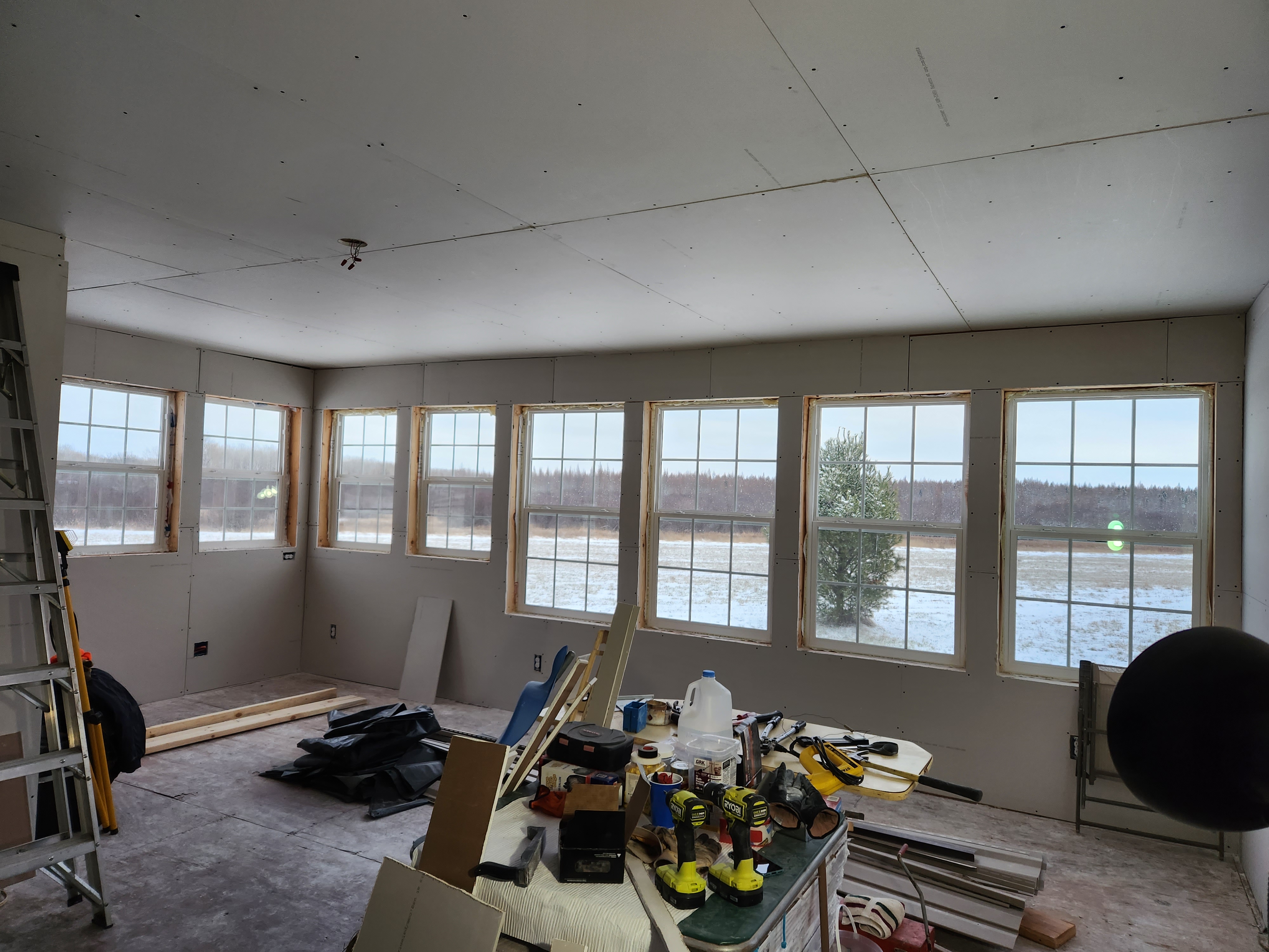 All that happened while I hung insulation, sheetrocked around all those beautiful windows, and mudded, taped, and sanded as though my life depended upon it…because it kind of does.