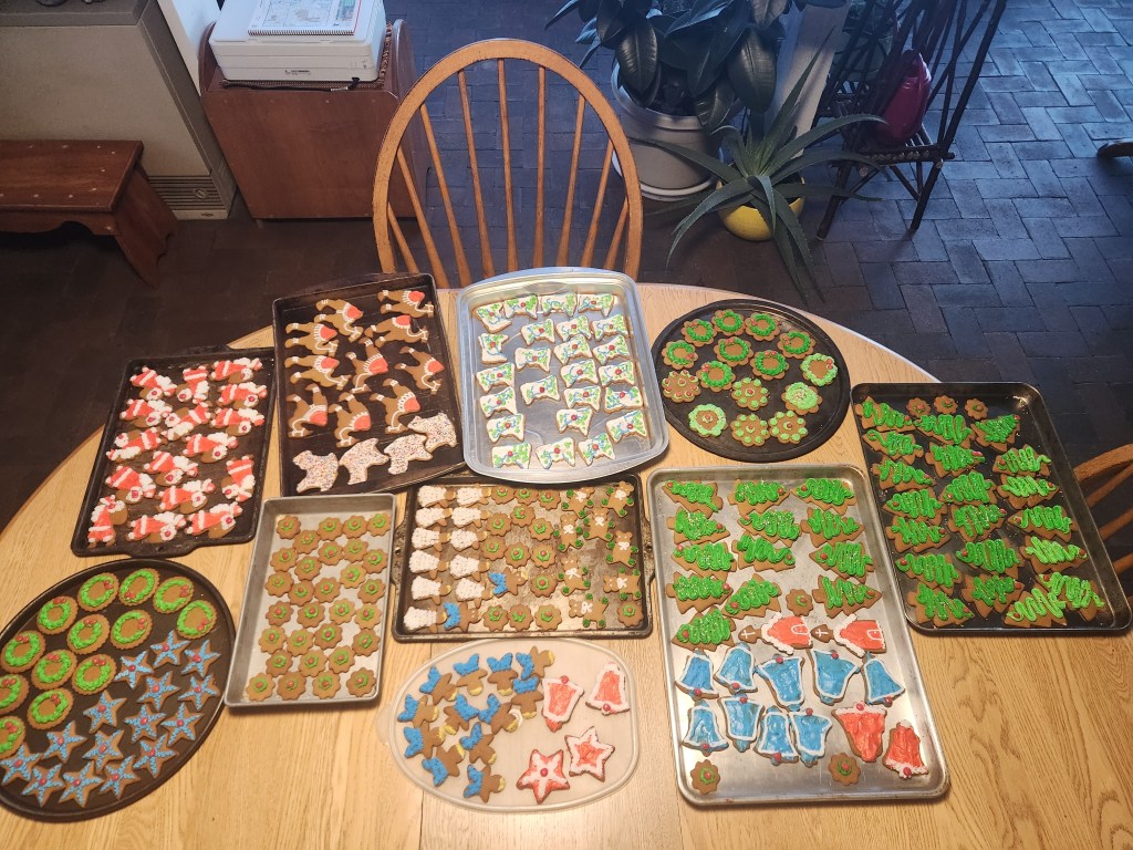 Holidays approached. Nostalgic aromas of gingerbread cookies and lefse filled the air. My sister sends dozens of home-baked gifts to relatives every year. When it was time to frost and decorate her creations, W and I pitched in.