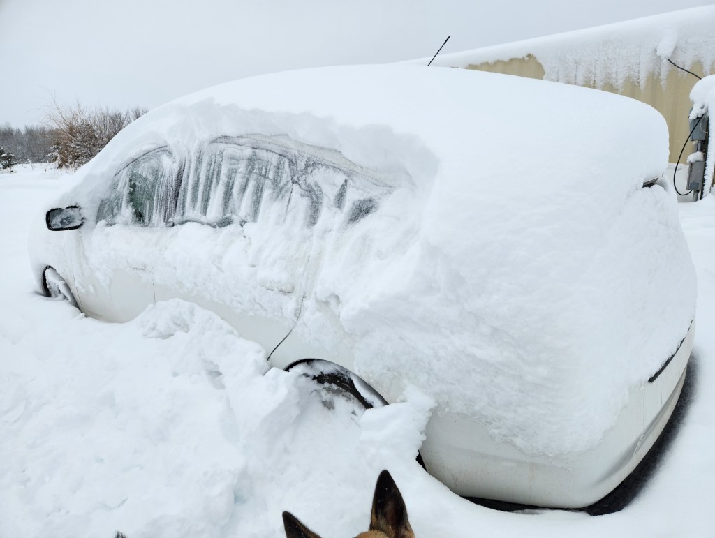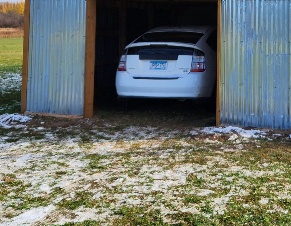 The car is tucked into its new garage space. The doors are finished and ready to be hung. It’s supposed to be warmer on Wednesday; a southwest wind. We’ll do it then.