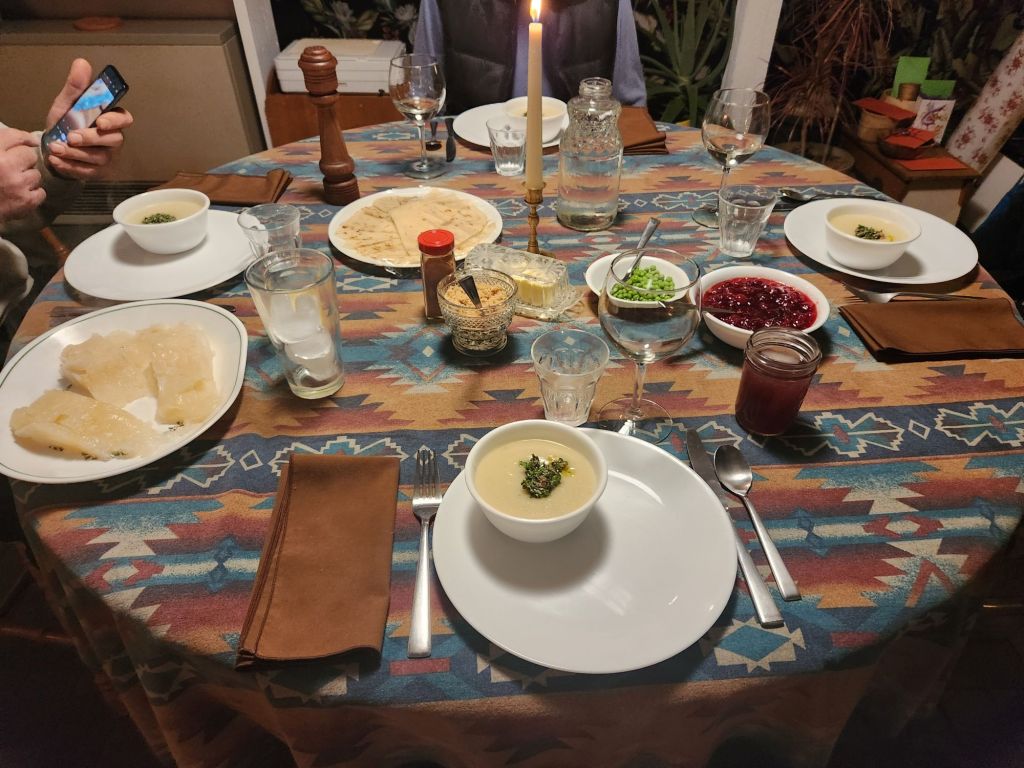 Then we feasted on colorless food true to our Norwegian and Swedish roots. Lutefisk with melted butter, potato/parsnip/pear soup with walnut/garlic/parsley garnish, and lefse. The peas and cranberry sauce added a festive pop. And bread pudding for dessert made a sweet finish to a magical night.