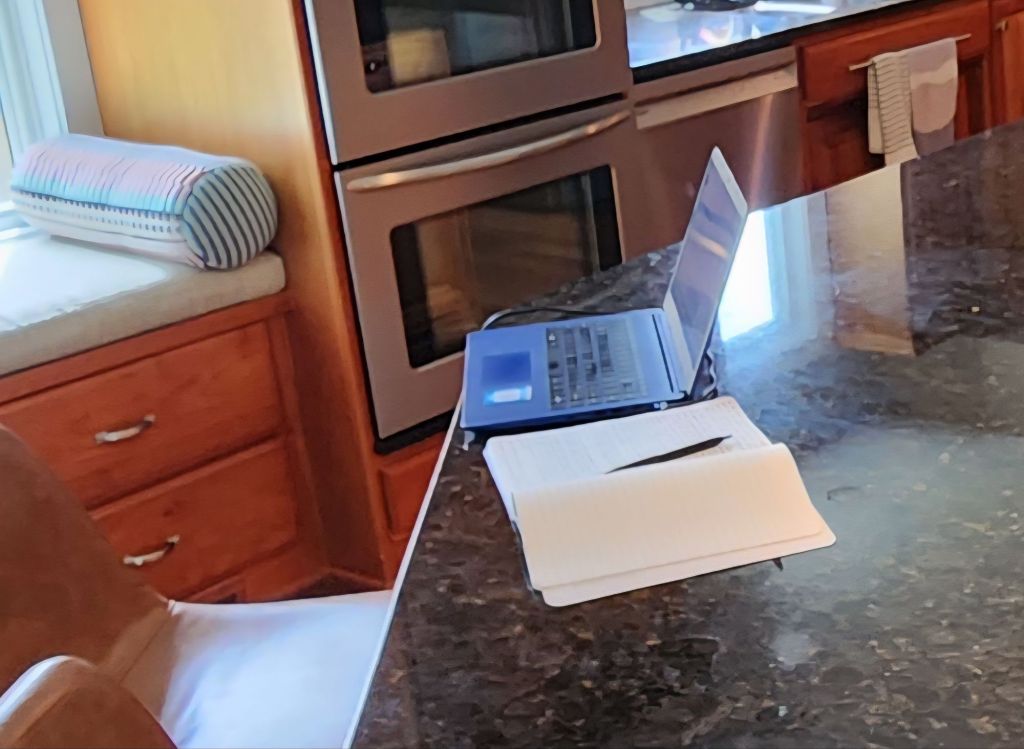 And here I am, sitting at my daughter’s monster kitchen island where the internet flows unhindered to my ancient HP.