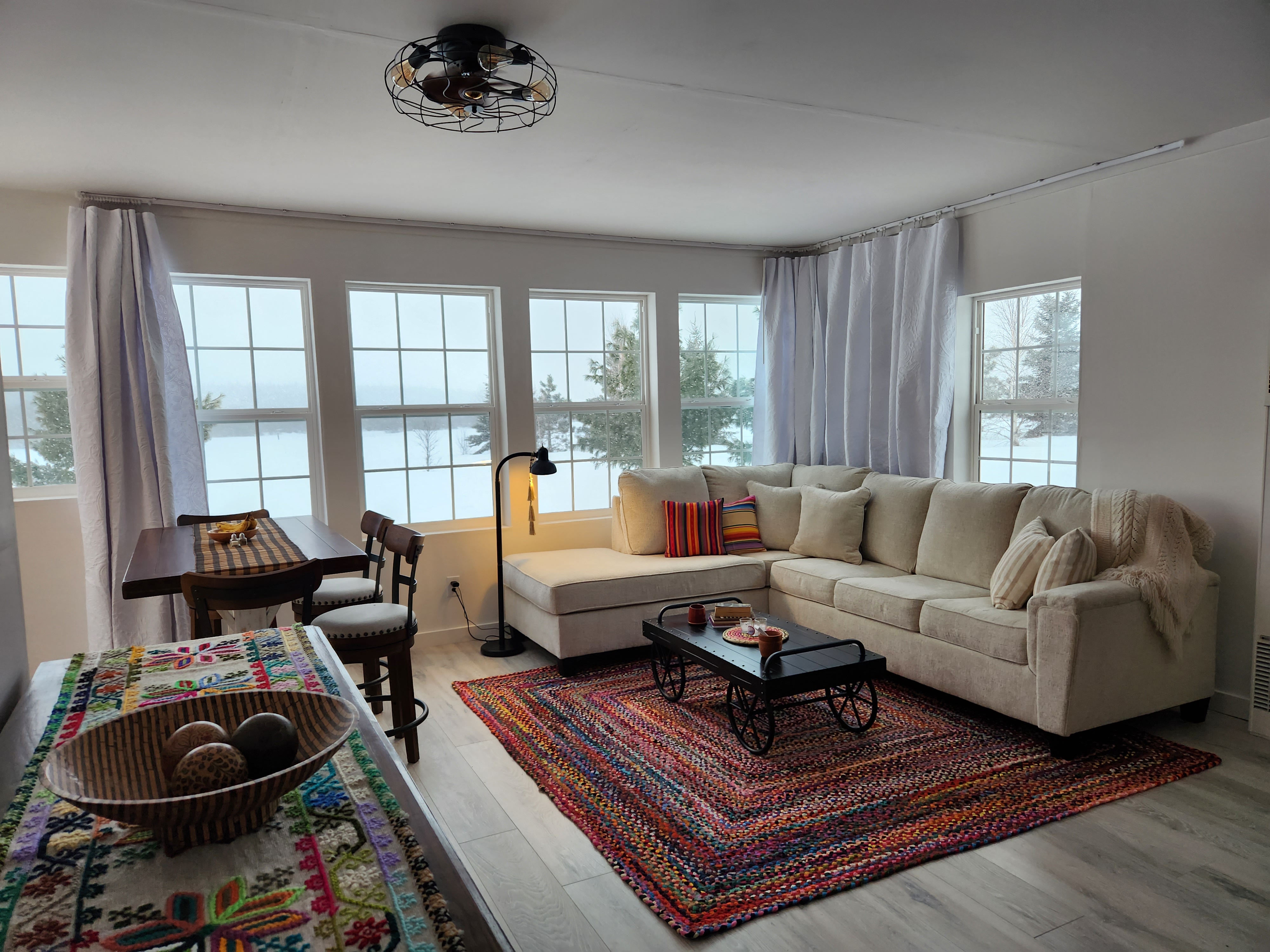 My walls, ceilings, and draperies are white. The floor is weathered gray. A monster sofa with sleeper bed tucked inside is the color of oatmeal. That monochromatic palette gives me the opportunity to accent with bright colors. I love the handmade braided rug from India and the two throw pillows from Mexico. The black mining cart coffee table and the wire ceiling fan lend themselves to an industrial theme. The bamboo runner on the dining island is from Bali, as is the bowl with batik wooden balls on the chest. The hand-embroidered wool runner was my very first purchase in San Miguel de Allende, Mexico. I bought it at the Tuesday Market from the woman who made it. I treasure these collected bits and pieces.