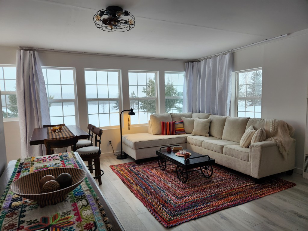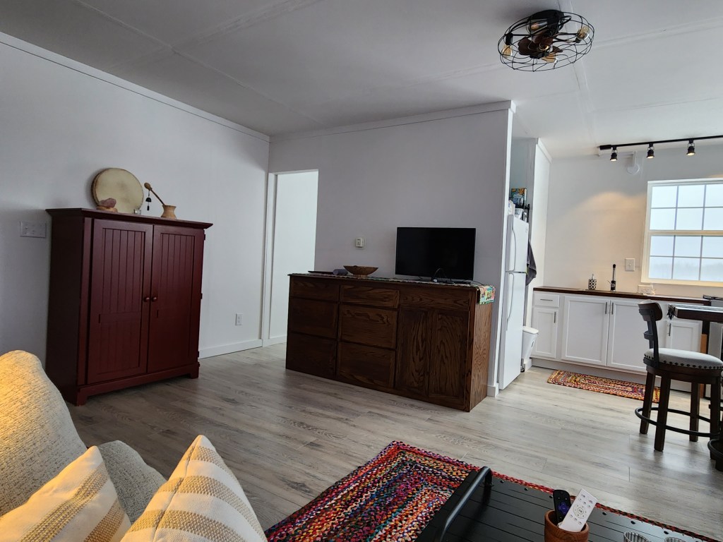 I wish I could give you an in-person tour of my sanctuary. But I’m here and you, my friends, are scattered all over the world. So photos will have to suffice for now. Here is my tiny home with industrial farmhouse decor at Granny’s Landing on the shores of Fantasy Bay.