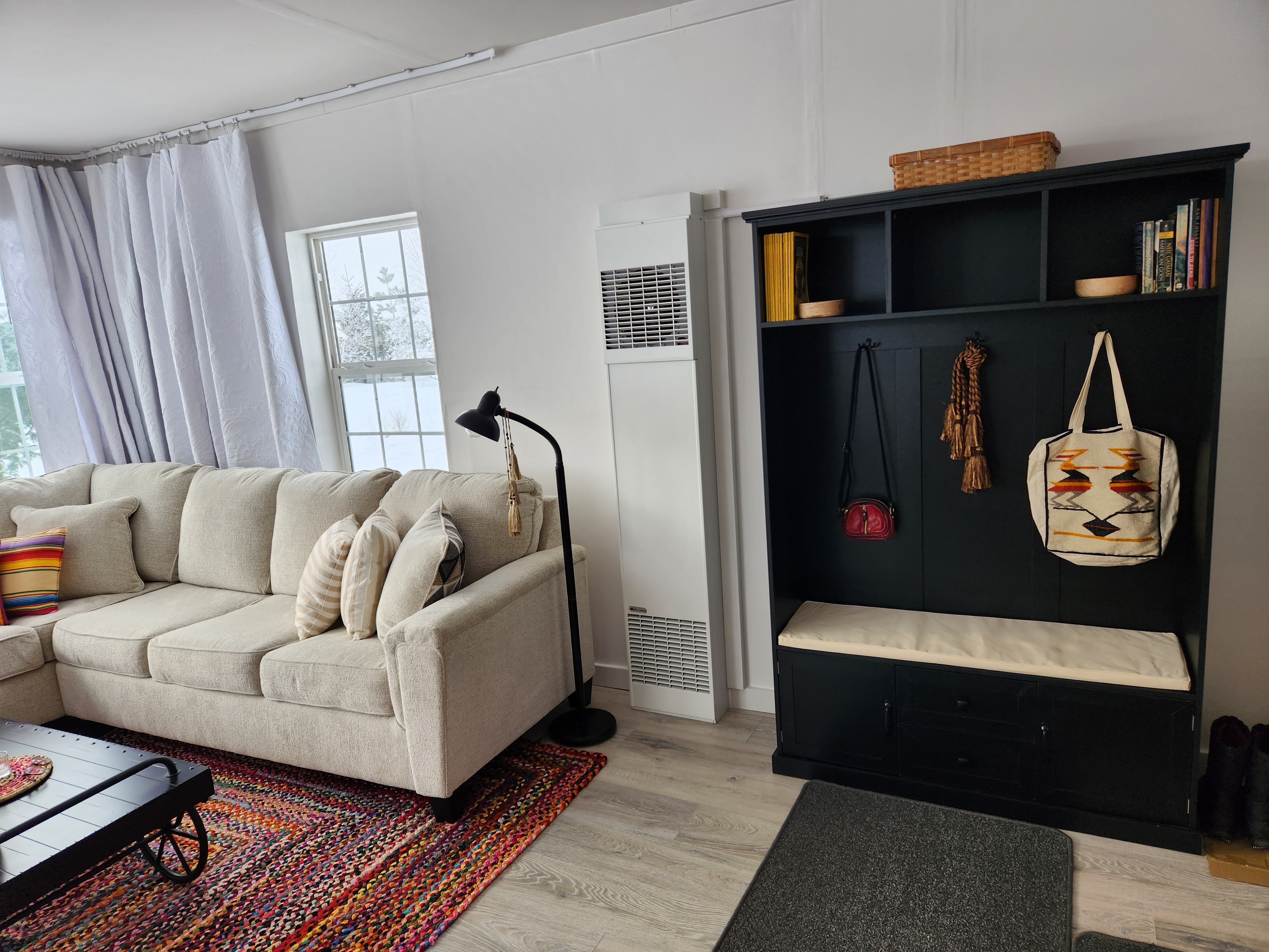 To the right of the front door, a black hall tree serves as a place to hang guests’ coats, with additional storage below the seat. Between that and the sofa is a forced-air furnace that keeps me toasty and oh so happy these cold, winter days.