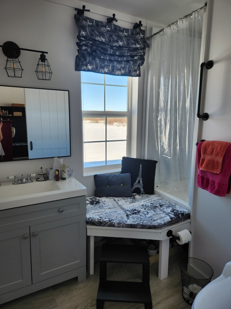 This room is just plain fun. All of my plumbing drains live under the shower. That required some wild creativity. Fortunately, the ceilings in this tiny house are 8 1/2 feet high – not the standard 8 feet – so we had an extra 6 inches to work with. The shower tower soars a lofty 20 inches off the floor. To access it, I needed a large, sturdy platform and steps.
