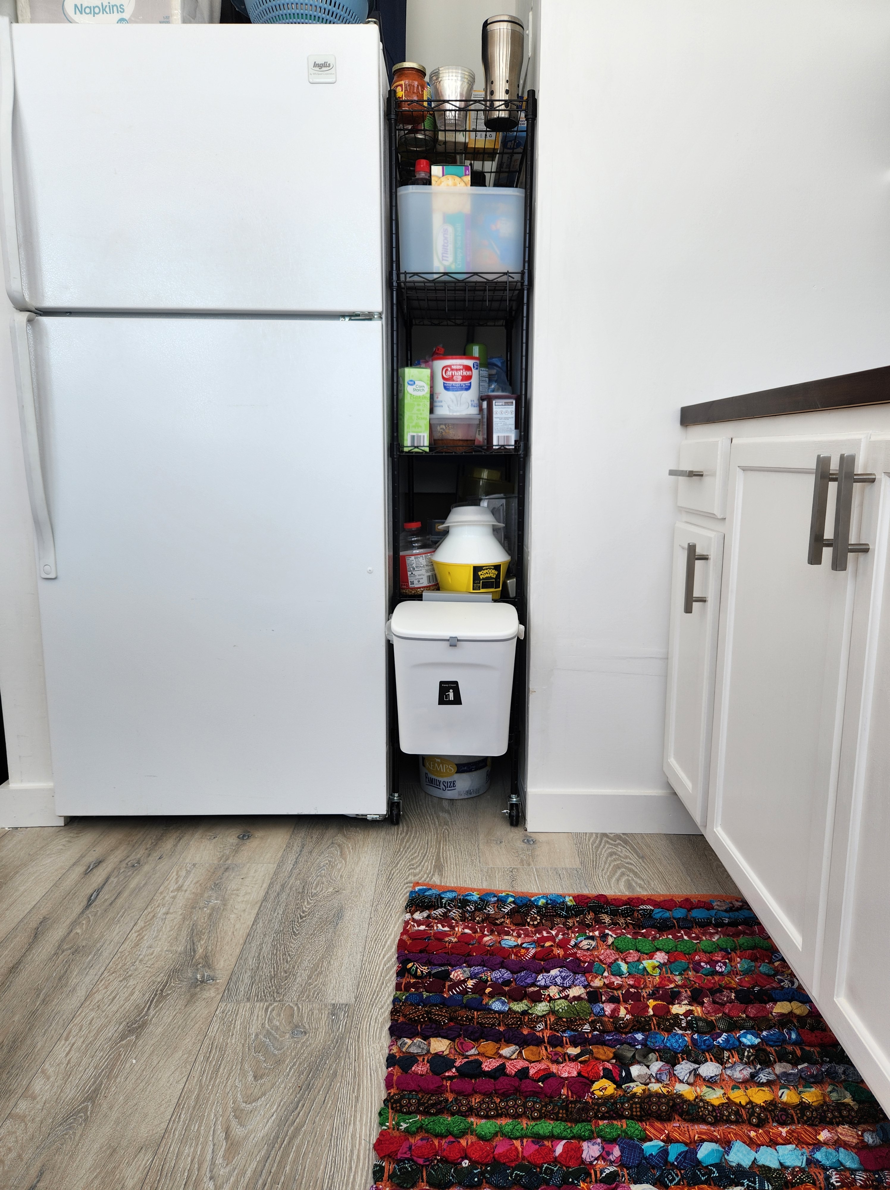 The refrigerator cubby accommodates a rolling metal shelf unit for additional storage. Part of the yet-to-be-completed task list is a cabinet over the refrigerator. Patience! Good things come to those who wait I’m told. And note the container suspended from the wire rack. That’s a space-saving hanging trash can I found on the Temu shopping website. Hiding under the shelves is a bucket for compost. My recyclables go into separate bags stashed out of sight.