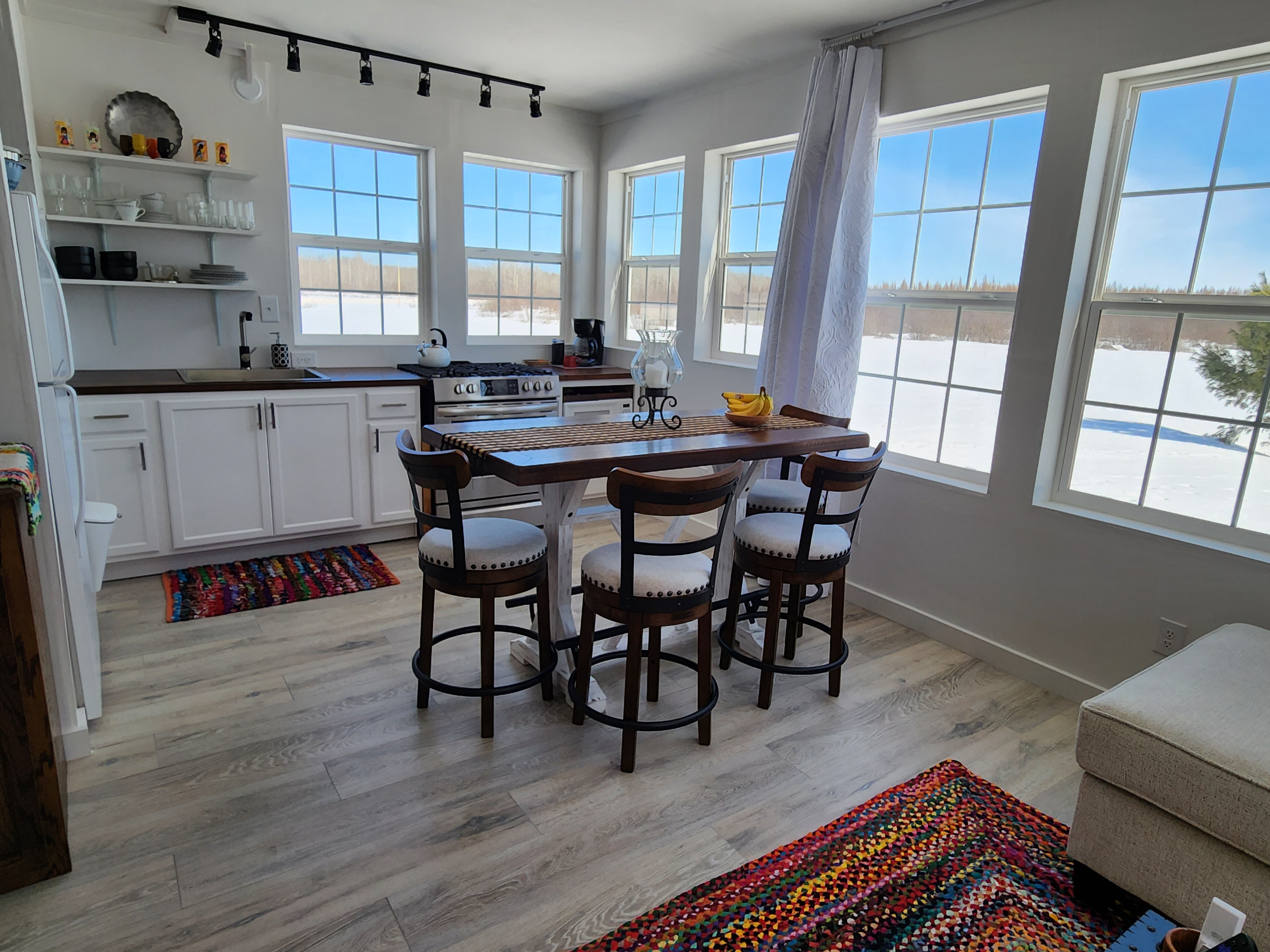 Continuing around the room, we arrive at the kitchen. It’s a compact space adequate for my needs. I wanted a counter-height dining table and this set checked all the boxes. I chose the rich, mahogany stain for the cabinet countertops to mimic the dark wooden surface of the dining island.