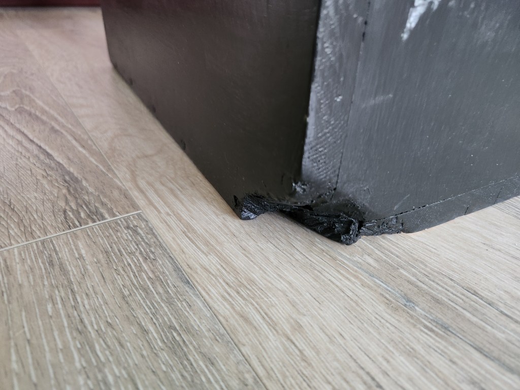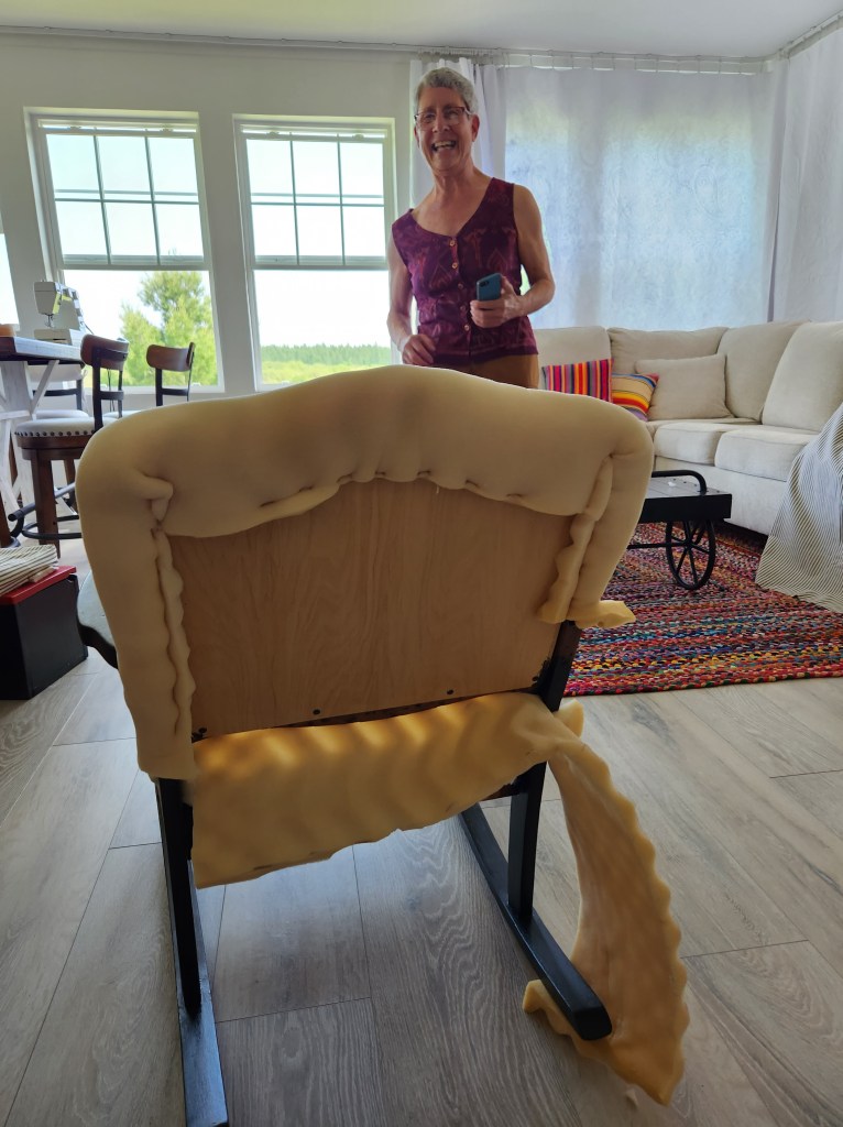 Gwen offered to help me ‘fix it up’ and found spongy foam for the seat and back in her sewing supplies. I screwed and glued, tightening the wiggly arms and legs, then painted the frame black.
