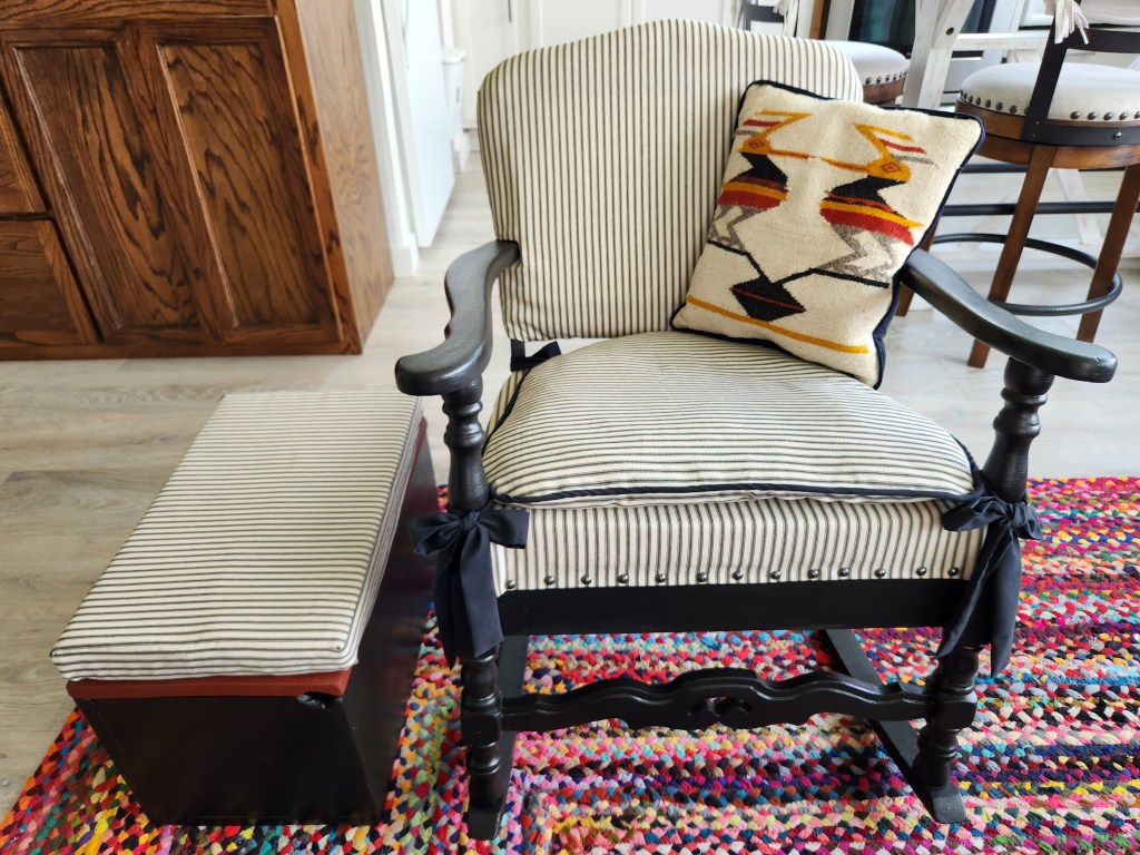 A rocking chair alone does not fulfill my definition of comfort. Something to elevate the feet is essential. I scoured the internet for a pouf or an ottoman spending hours scanning every conceivable option, but nothing grabbed me.