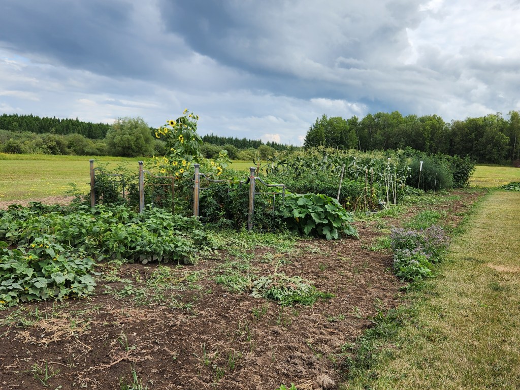 And cucumbers – Gwen’s been pickling and jars line up like a platoon of soldiers. Tomatoes are ripening, and so is the corn. Carrots will soon be big enough to pick and preserve. There are a hundred garlic bulbs drying on a wire rack in the garage.