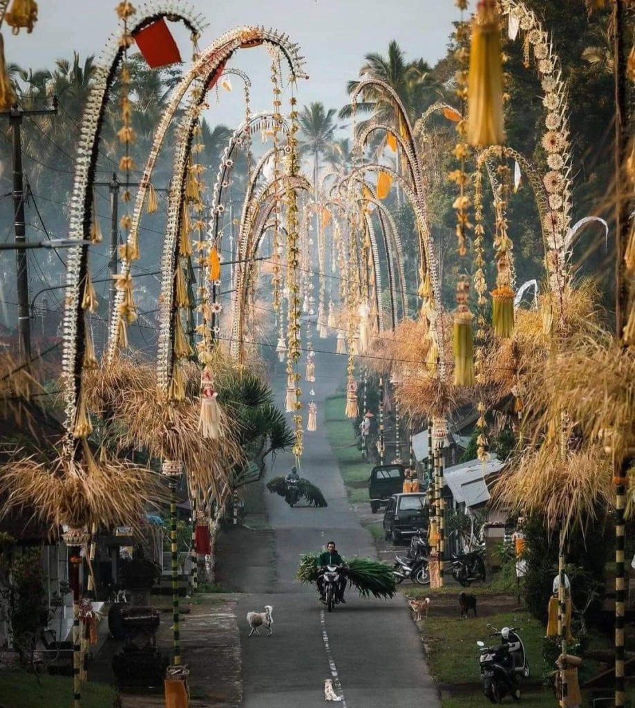 As much as I’m physically here, my mind still swirls in the surreal elsewhere of multiple realities. I messaged Ketut, in Bali, to wish him a happy birthday. Selamat ulang tahun, Bapak Ketut. Sudah potong kuenya? He answered that he did not have a birthday cake because his birthday fell on the celebration of Kuningan, and there were already many offerings of sweets. My mind’s eye saw graceful penjors arching over the streets, and women in their see-through lace tops and satin sashes, carrying towering offerings on their heads.