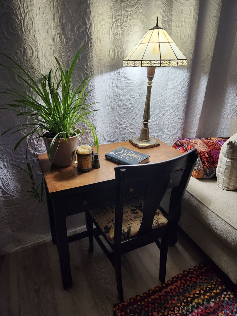 I found it last week on Marketplace, in North Branch, Minnesota. I’m typing this post on its impeccable wood top, sitting in the adorable chair that came with it. My very small house is filling up with accessories for my unfinished loft. But that’s what happens with visualizing what I want. It manifests! And the Universe doesn’t care about timelines. It just gives me what I ask for.