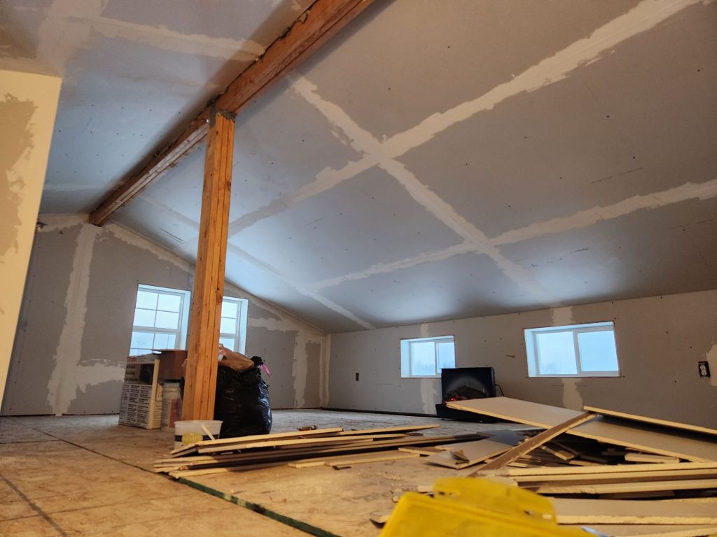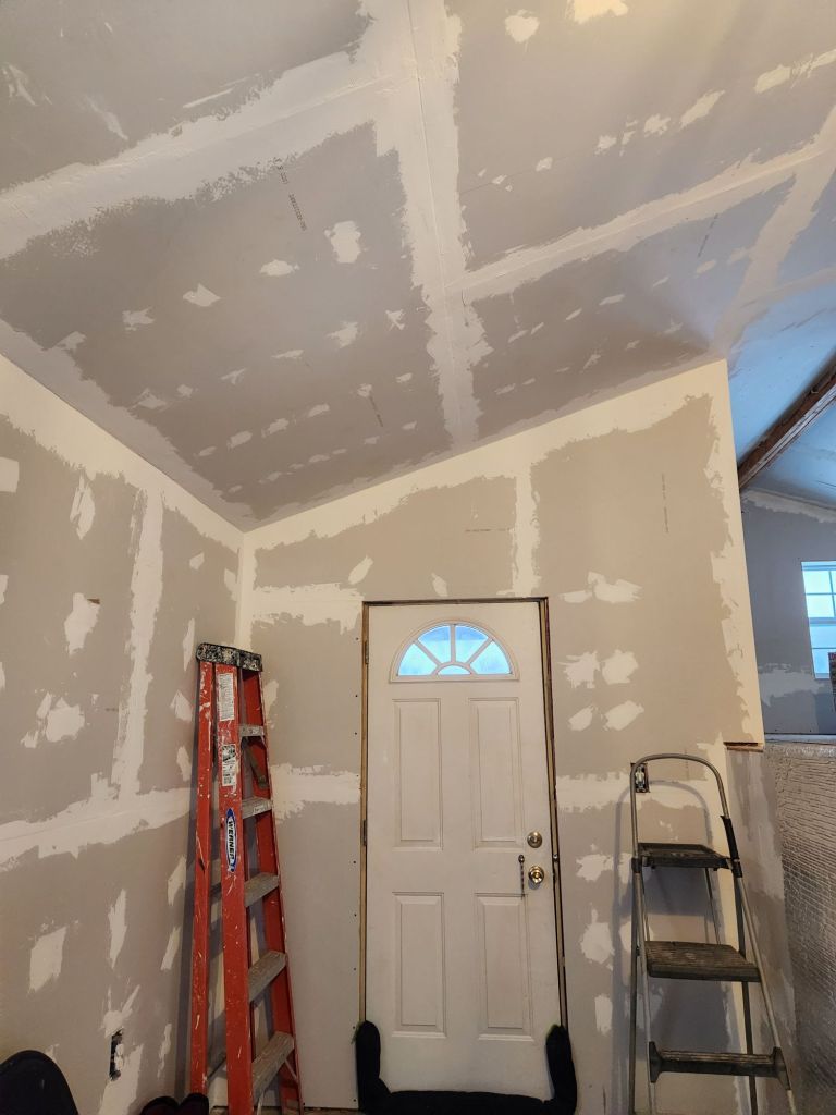 At this very moment, my Prius is tucked securely away from inclement weather, safe and sound. I’ve sheetrocked the entryway and loft, and today I spent several hours mudding the seams.