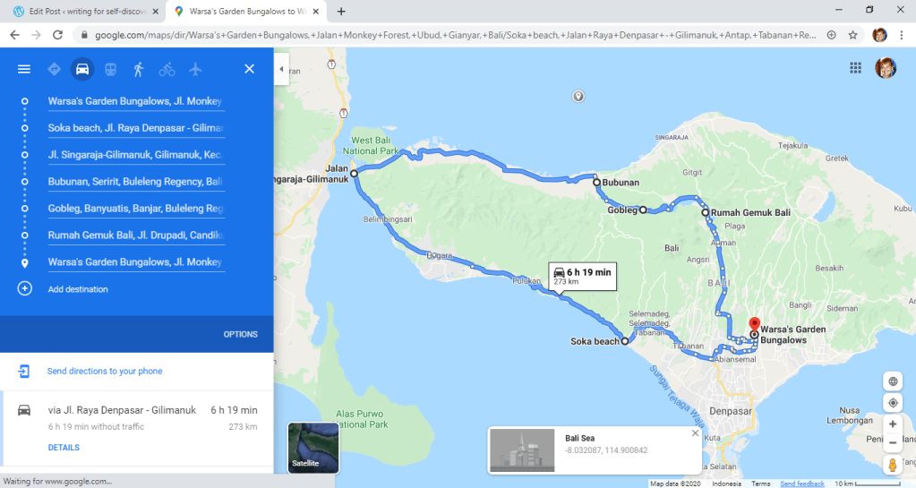 “Where are we?” The wind grabbed the name he spoke and blew it away. “What?” I shouted. He pointed to a row of rocks behind me. Red paint spelled out Pantai YEHLEH. Yehleh Beach. I checked Google maps. At 10:30 we were barely one-quarter of the way into our journey. I did the math. What was supposed to take a total of under seven hours, according to Google, by my calculations added up to ten. With no stops.
