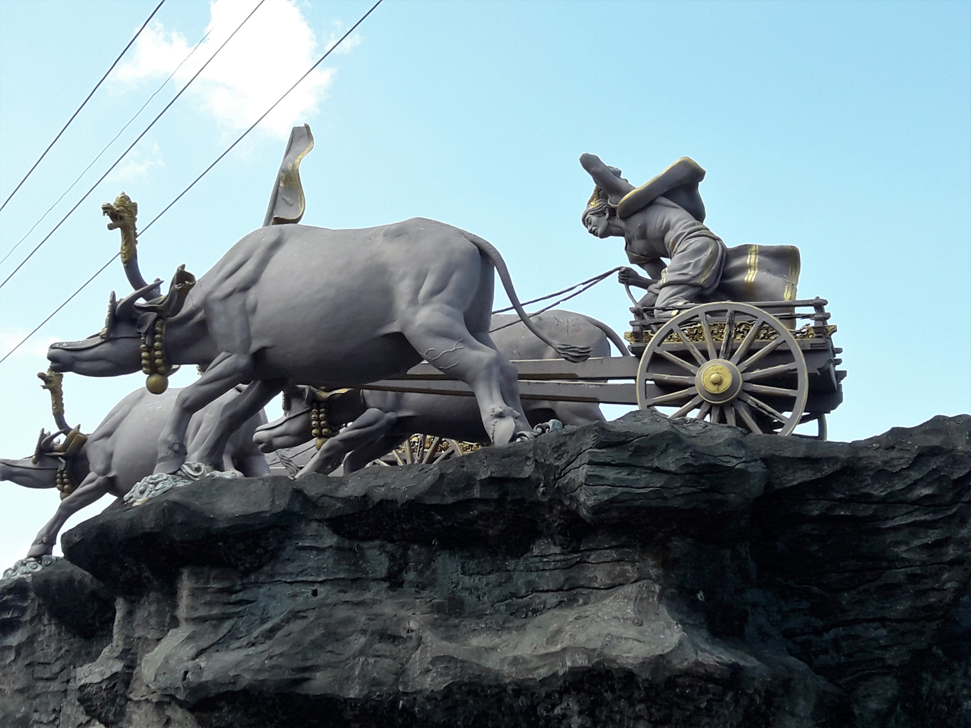 Everything ahead of us was new territory. The flat land rolling past alternated between groves of stately palms and glistening paddy fields. Mesmerized, I drifted into a meditative trance and was jerked awake when the bike stopped. “Famous statue,” Ketut said.