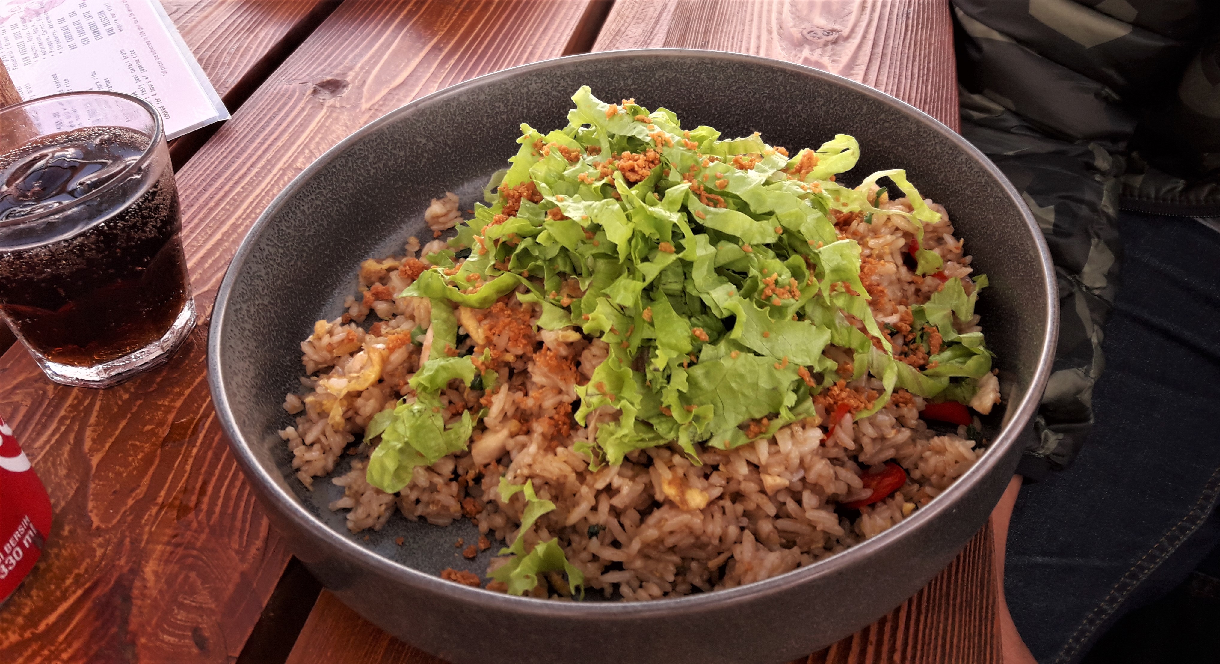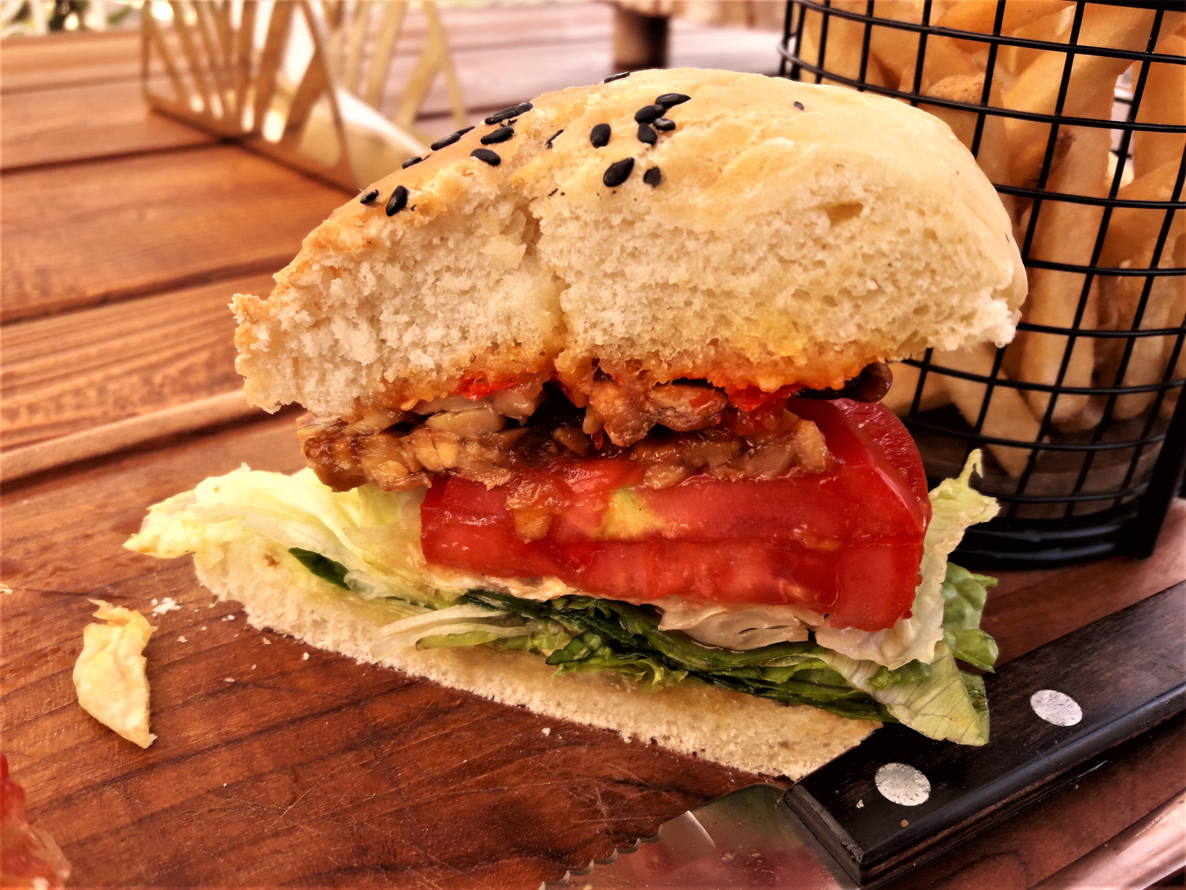 I finally calmed down enough to look at the menu. There was something for everyone. Ketut ordered fried rice with chicken and I had the vegan burger and fries. The subtly sweet sauce on the tempe gave extra pizzaz to the mouthwatering meal.